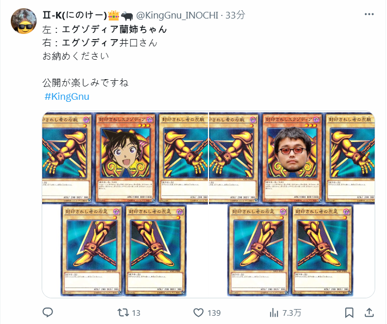 今日 ( 4/20 ) 晚間身為樂團核心、主唱與吉他手的常田大希在個人 Instagram 上開直播,聊聊最近的生活與樂團的未來計畫,沒想到引起熱烈討論的,是關於 King Gnu 替《劇場版 名偵探柯南:獨眼的殘像》所唱的主題曲新歌「TWILIGHT!!!」的 MV 拍攝靈感,居然是「艾克索迪亞小蘭姐姐」( エグゾディア蘭姉ちゃん ),這奇怪的詞也瞬間成為 X 趨勢關鍵字熱搜,到底是什麼鬼 www。