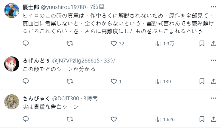 其他網友也解釋,看不懂其實很合理,希洛那時候真正的想法,動畫根本沒好好解釋,真的要理解需要時間更細細品嘗人物的思維。這就像富野式台詞一樣:「我不說你自己應該懂吧」的更高難度版本XD