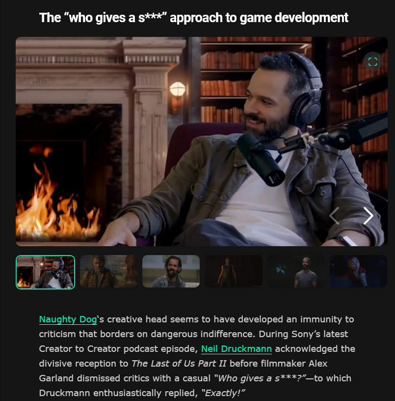 頑皮狗工作室(Naughty Dog)創意總監尼爾·德魯克曼(Neil Druckmann)先前與 Sony《Creator to Creator》Podcast 節目,與《28年毀滅倒數》(28 Years Later)導演艾力克斯·嘉蘭(Alex Garland)進行對談。節目中,德魯克曼談及《最後生還者第II章》(The Last of Us Part II)所引發的爭議時表現出的態度,引起部分外媒與玩家社群的關注與討論。