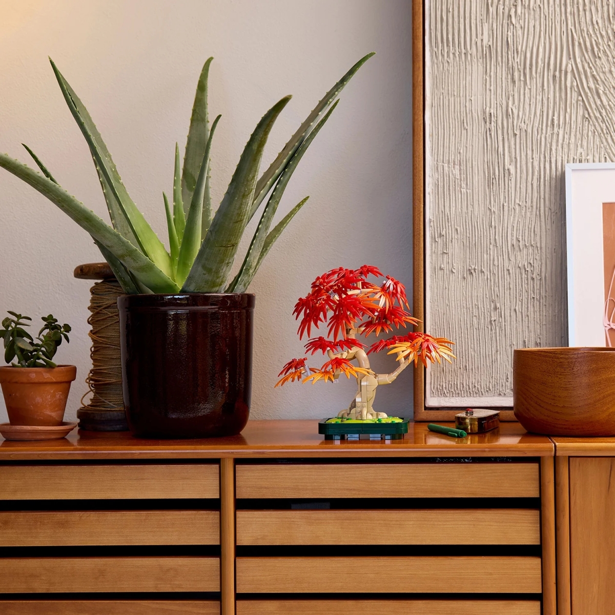 首先看到的是擁有 474 片零件、展現出火紅炙熱視覺效果的日本紅楓盆景樹,組完之後高度來到 24 公分,不僅細膩勾勒出優雅的樹形、清秀的枝條,以及奪目的橘、紅色葉片,底部的綠色盆景也展現出俐落的簡約美感。以沙色為主調的樹幹、枝條採用了樣式豐富的零件來勾勒,近看能夠感受到樂高零件的造型魅力,遠觀則能充分欣賞迷你盆景樹散發出的獨特美感。擺在家裡的任何角落都能為其增添靜謐的安寧氣息,小編個人可說是超級大推啊!