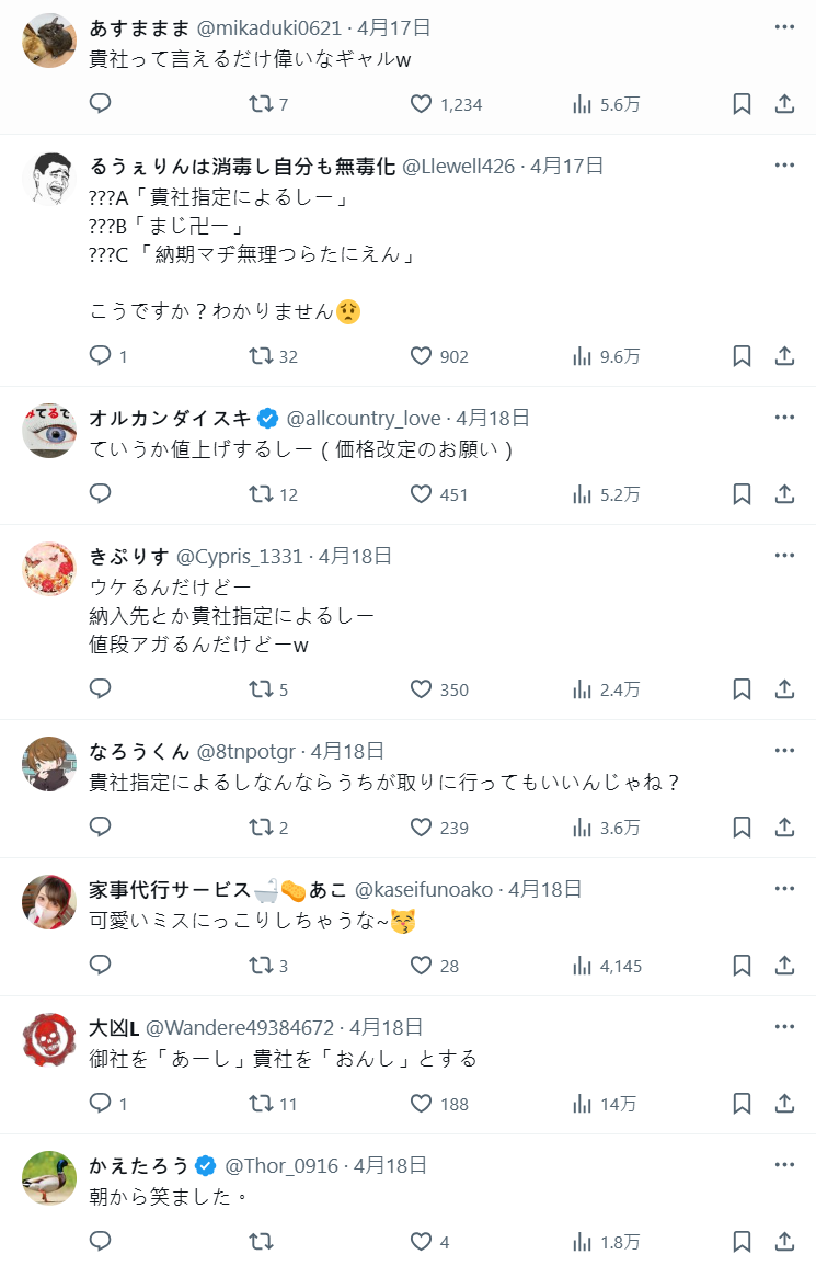 但很可惜(或該說可喜?),這位推主あぎとぅ其實並不是辣妹,只是單純手滑,輸入時不小心多打一個「し」而已。只是這一個字,卻讓整份商務文件風格大變,讓人不禁佩服日文語感的微妙深奧。