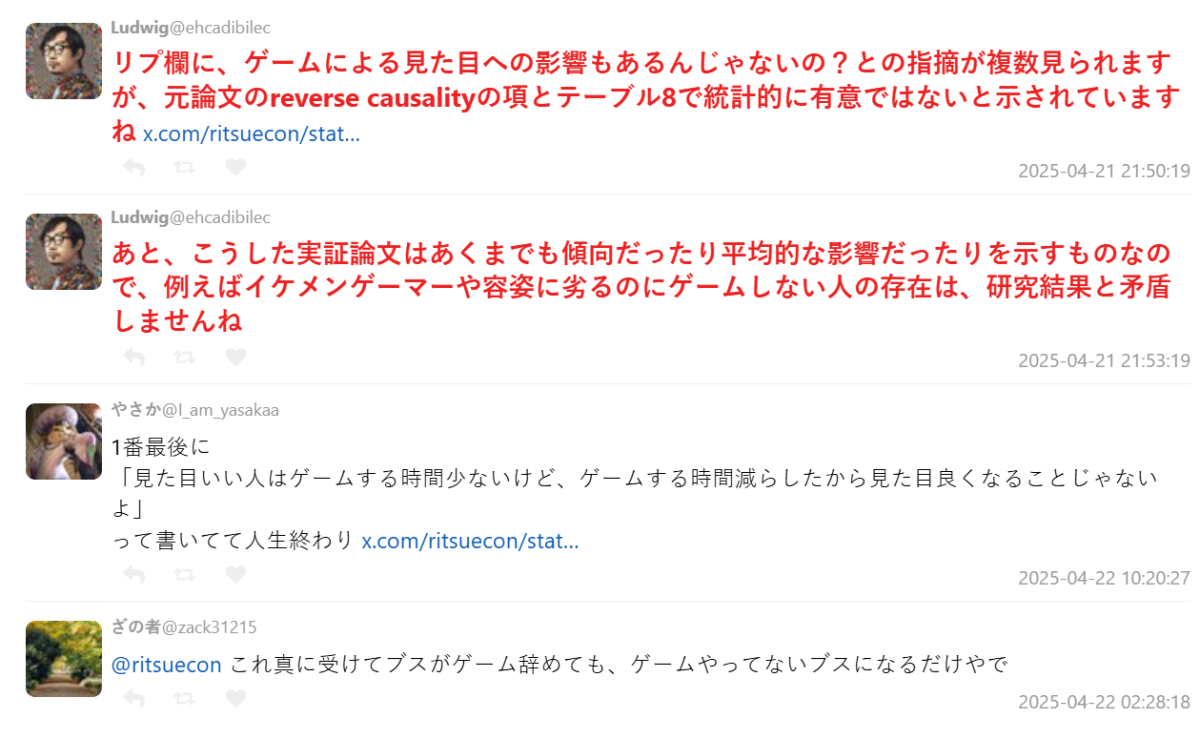 有網友看到之後回說:「欸那是不是打少一點電動,我也會變好看?」——答案是不會喔。有網友 Ludwig 解釋,原論文在處理「反向因果關係」時也說明了這點:「減少遊戲時間,並不會讓你的外貌變好看。」研究裡的統計也沒顯示兩者有顯著關聯。