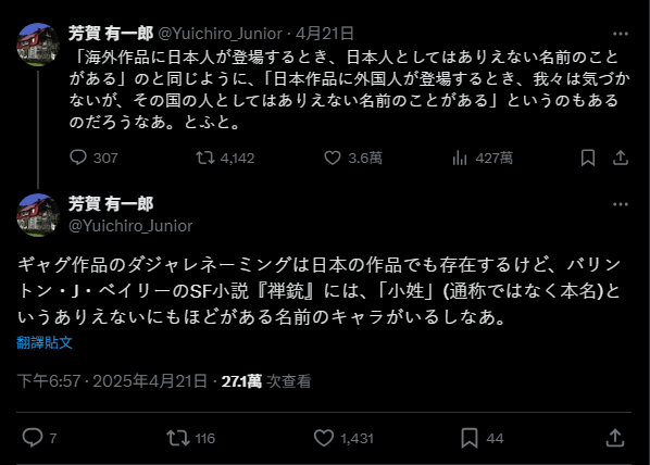 名為芳賀有一郎(@Yuichiro_Junior)的日本網友在 X(原 Twitter)上發文表示:「就像海外作品中出現日本人角色時,有時會取些根本不可能是日本人名字的名字一樣,我突然想到,日本作品中出現外國人角色時,或許我們沒注意到,但對該國人來說也是根本不可能成立的名字,應該也有吧。」