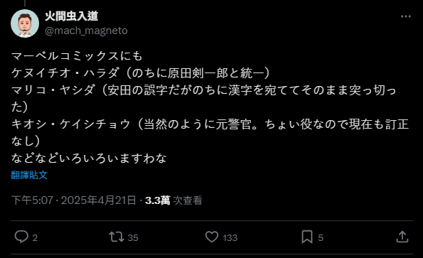 甚至也有人舉例Marvel Comics的例子表示:「在漫威漫畫裡也有不少這種例子,像是『銀武士』,本名叫做原田劍一郎;還有『矢志田真理子』(原本是把「安田」誤寫成「矢志田」,但後來直接配上漢字就照用下去了);還有一個是日本警官Kioshi Keishicho,只不過因為是小角色,所以目前也還沒被更正。」