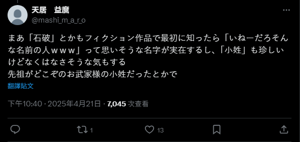 此推文引發讀者熱議,有網友表示:「話說回來,像『石破』這樣的姓氏,如果是先從虛構作品裡聽到的,應該也會讓人覺得『哪有人叫這名字啦哈哈哈』,但現實中其實是有這個姓的。而『小姓』這個名字雖然很罕見,但說不定也不是完全不可能存在,搞不好是因為祖先曾是某位武士家的小姓也說不定呢。」