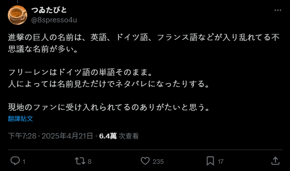 另外,也有網友以日本國內自己的漫畫舉例說明:「《進擊的巨人》裡的名字混雜了英文、德文、法文等語言,常常讓人覺得既奇妙又有點違和感;至於《葬送的芙莉蓮》,角色名字就直接用了德文單字。對某些人來說,光看到名字就可能被劇透了。當地的粉絲們還能接受這些命名方式,真的讓人覺得很感謝。」