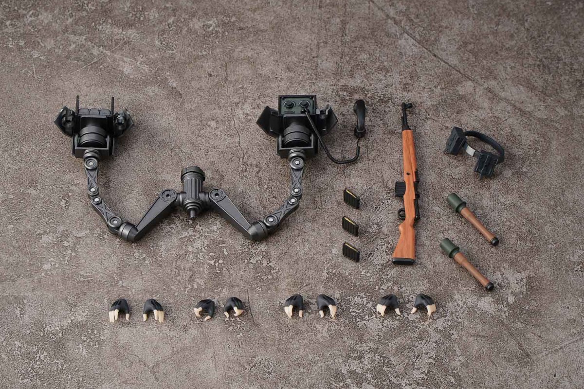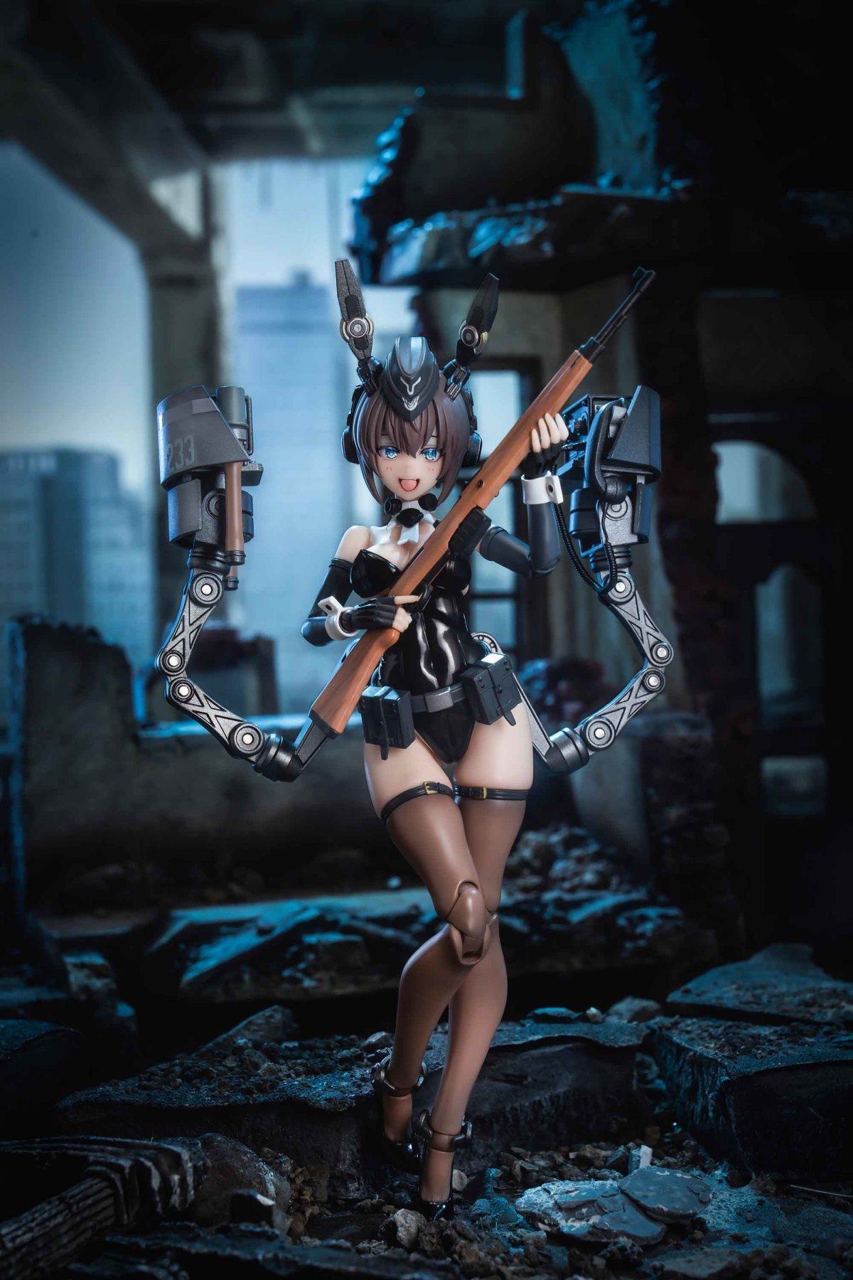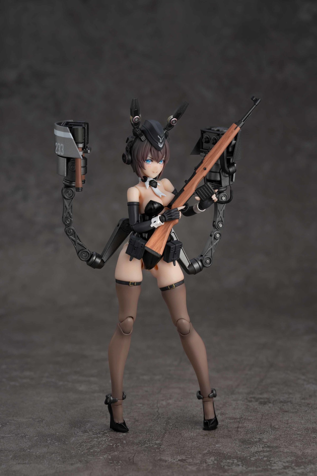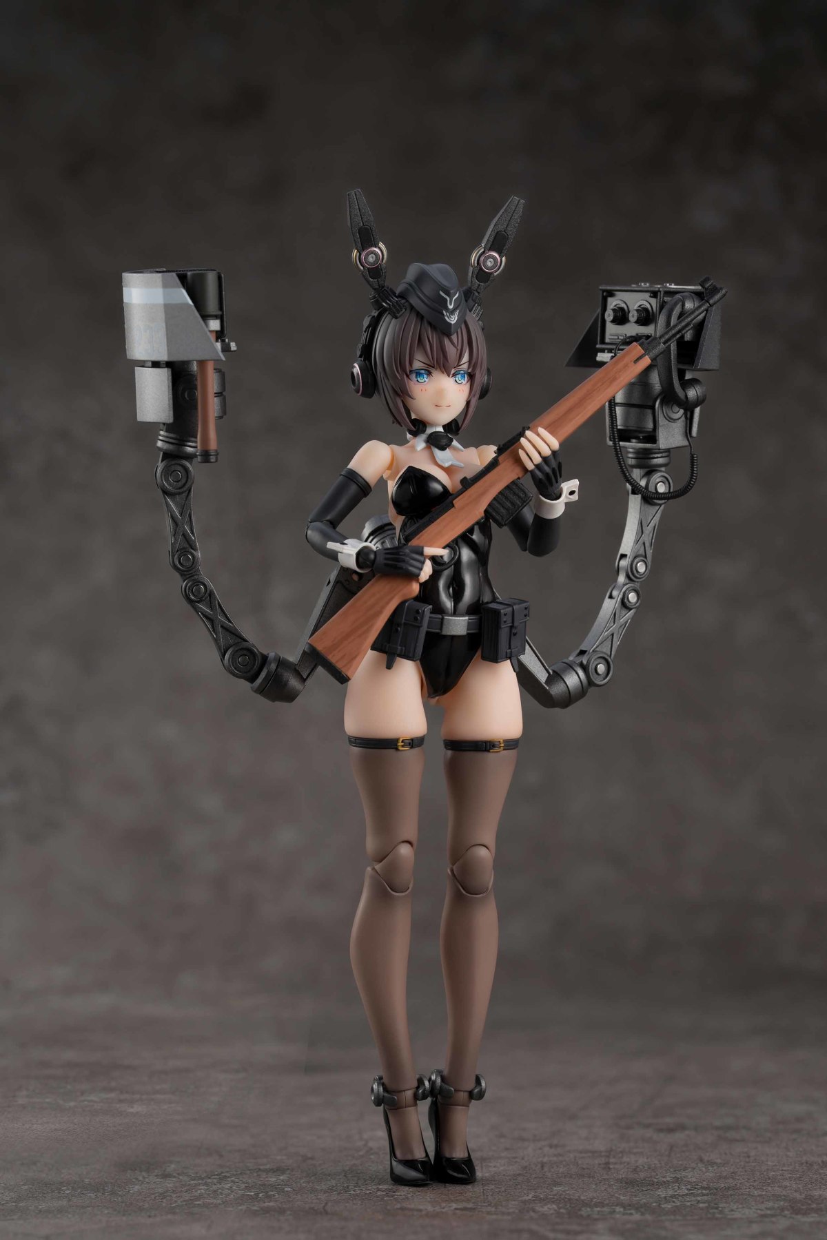 另外還有另售的「裝甲兔女郎武裝配件包」,帥氣的機械臂設計有多個可動關節,能調整角度與長度。武裝表面採用金属質感的塗裝,增加冰冷的色彩;首次在武器上使用擬真木紋涂塗裝,彈匣內部的子彈細節也非常精緻。搭配替換手勢,電話與電話線都能拿起來使用賞玩。