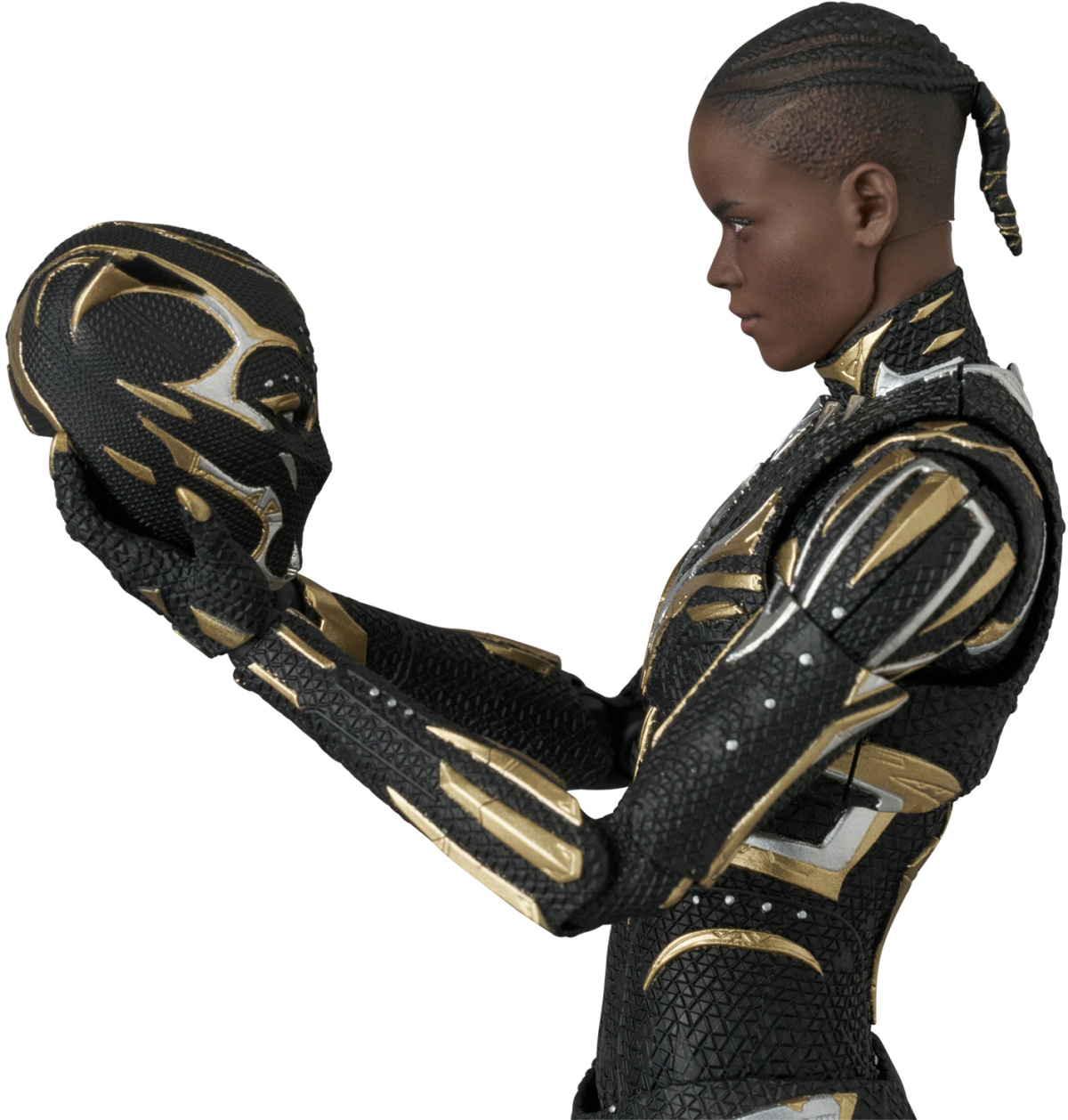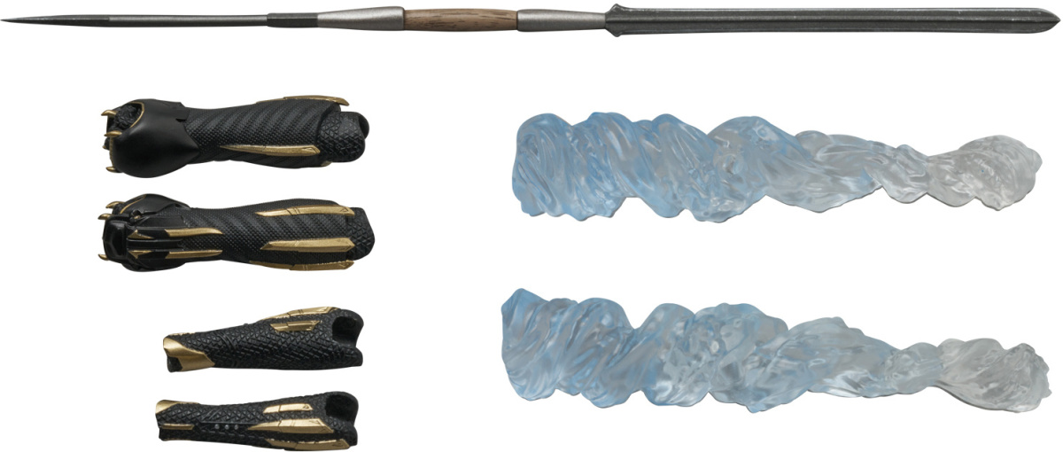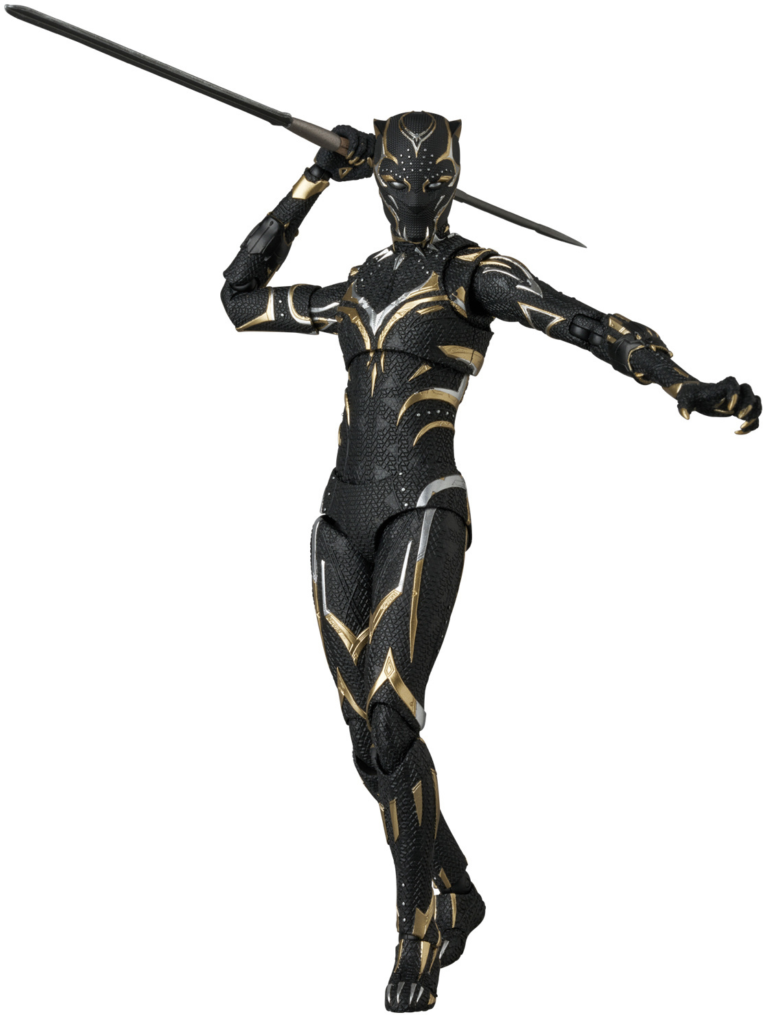 本次的黑豹可動人偶高約14.5公分,還原她在電影中身著戰衣的造型,細膩重現不同於帝查拉的黑金配色戰衣細節,菱形的紋路、金色配飾都被精緻再現!配件部分附有一款舒莉的頭雕,雕刻還原演員莉蒂西亞·萊特(Letitia Wright)的精緻五官,並收錄有手砲、長矛等在電影中使用的武器,可以搭配特效與靈活可動重現各種帥氣的動態!