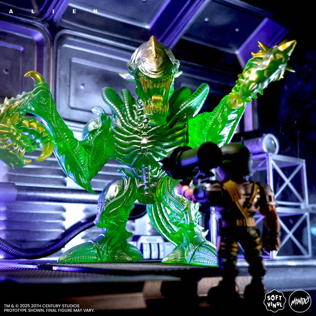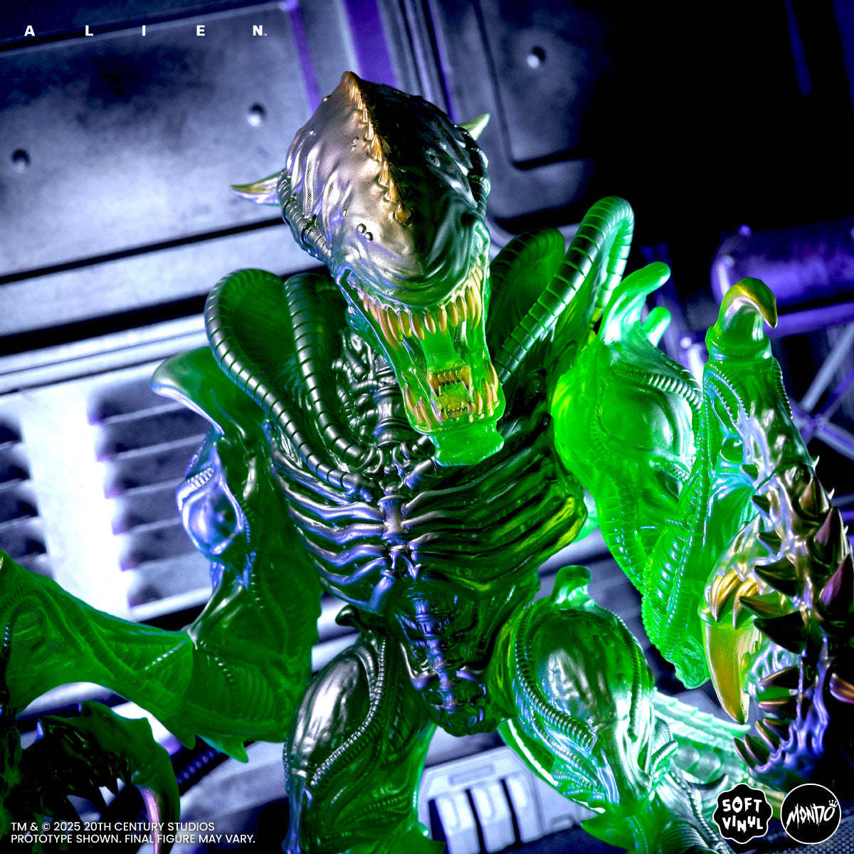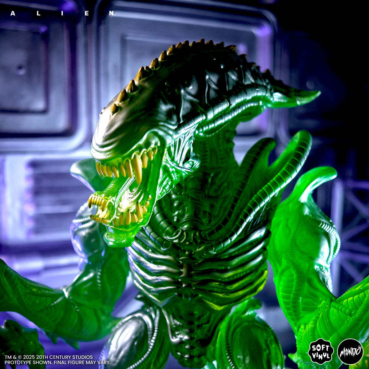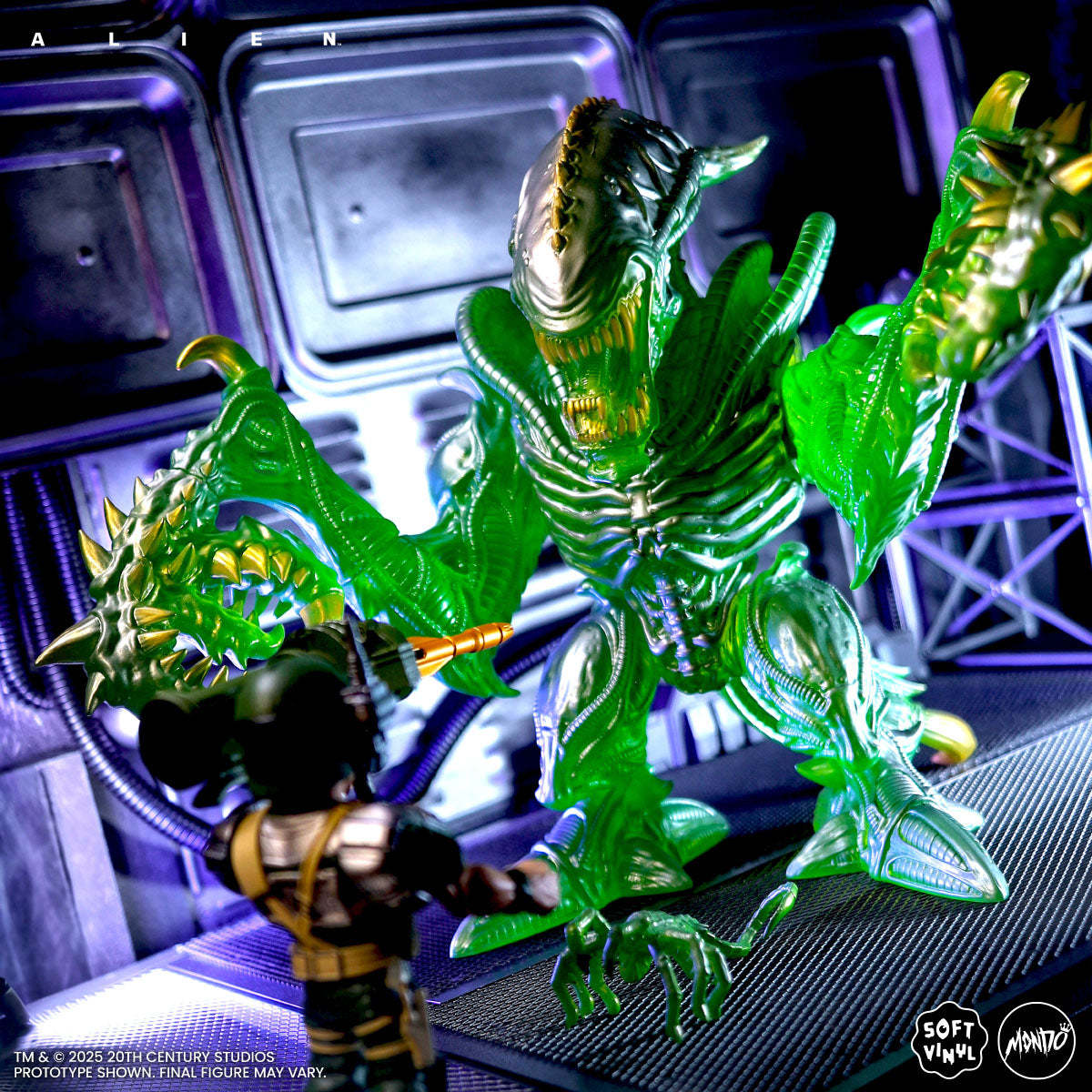 本次的螳螂異形軟膠模型高約26.6公分,由知名玩具設計師、藝術家James Groman參考Kenner過去在玩具系列推出的變體螳螂異形重新打造,雕刻展現充滿生物感與肌肉感的造型細節,口中的小嘴還具有伸縮功能,張開的血盆大口和雙手銳利的爪子令人不寒而慄!團隊採用了參考強酸血熔解金屬效果的銀綠配色作為一期色,在光線下散發出詭異而華麗的光澤!