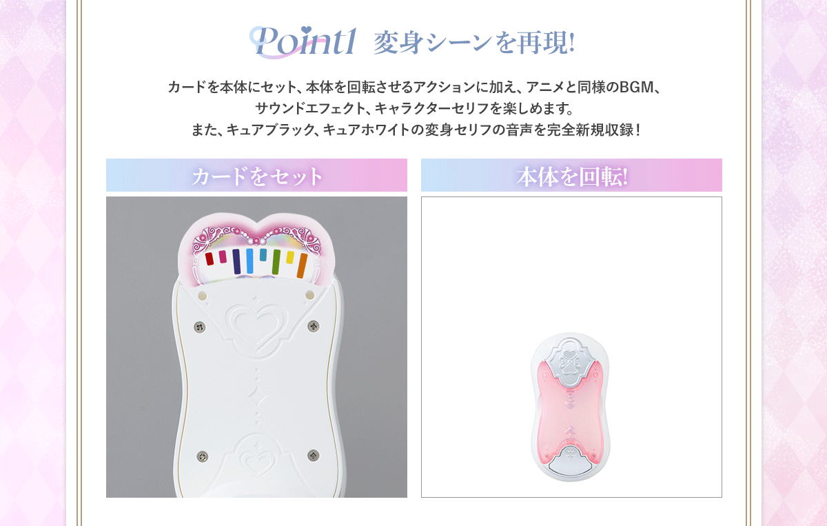 本次的Pretty Memories心動通訊變身器將黑天使跟雪天使在《Max Heart》中使用的心動通訊變身器1:1比例還原,外殼的徽章部分採用銀色箔壓,高質感重現動畫中道具的外觀,可以使用藍、粉兩色的替換透明殼以及美波和米波的貼紙在黑天使跟雪天使的心動通訊變身器間切換!此外將附屬的卡片插入主機後旋轉主機還能夠觸發動畫中經典的變身背景音樂、音效以及特別全新錄製的黑天使跟雪天使變身台詞,讓各位玩具人可以親自變身光之美少女!