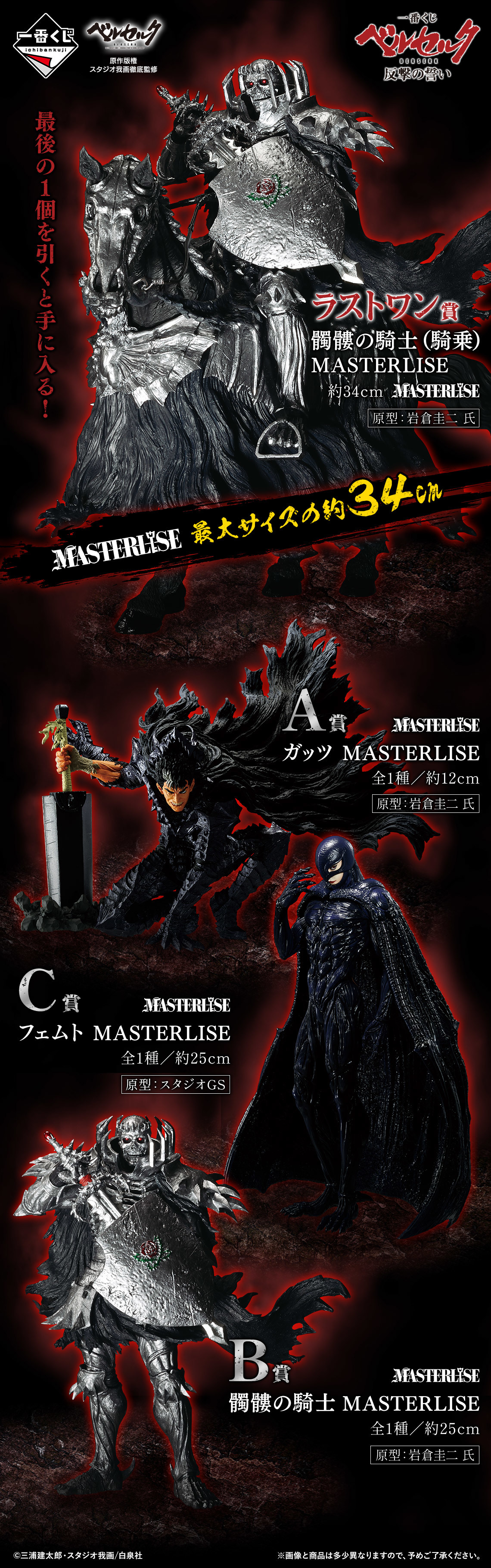 「一番賞 烙印勇士 反擊的誓言」,由STUDIO我画徹底監修,推出 A賞 ~ H賞 +最後賞等豐富的獎品!採用高階造型「MASTERLISE」系列打造的角色模型,細膩再現精緻的服裝細節,搶先公開:A賞 凱茲、B 賞 髑髏騎士、C賞 費姆特,最後賞的髑髏騎士(騎乘),更是高達 34 公分高的魄力造型&尺寸!更多商品資訊將陸續公開,有興趣的玩具人請鎖定後續報導~