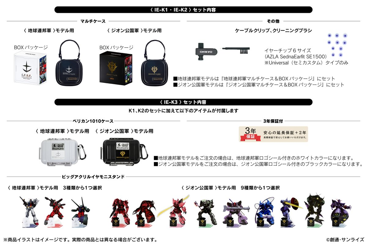 而最高規格的 IE-K3 SET,除了前面 IE-K1 或 IE-K2 SET有的,還附有特製「Pelican 1010 硬殼盒」供收納,更可以選擇對應勢力的機體壓克力耳機展示架一個,以及三年的保固。