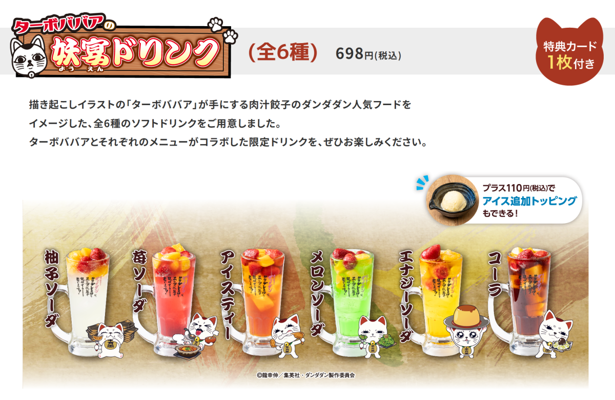 這次合作主視覺以依附在招牌貓的高速婆婆為主題,推出的飲品當然也是讓高速婆婆來擔當宣傳,有一系列飲品可以搭配店內的招牌餃子享用。
