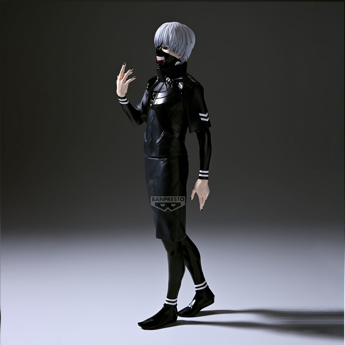 本次的Grandista金木研高約27公分,採用的是動畫第二季《東京喰種√A》中金木覺醒後為了讓自己變強、保護大家而加入青桐樹後的造型,雕刻還原黑色戰服上的皺摺細節,外套上以消光及亮光兩種漆色展現漆皮與布料的質感,標誌性的牙齒面具與白髮也被精緻還原,露出的赫眼透露著強大的殺氣,並做出了從壁虎那裡繼承而來的折手動態,光是站姿就散發令人不寒而慄的強大氣場!