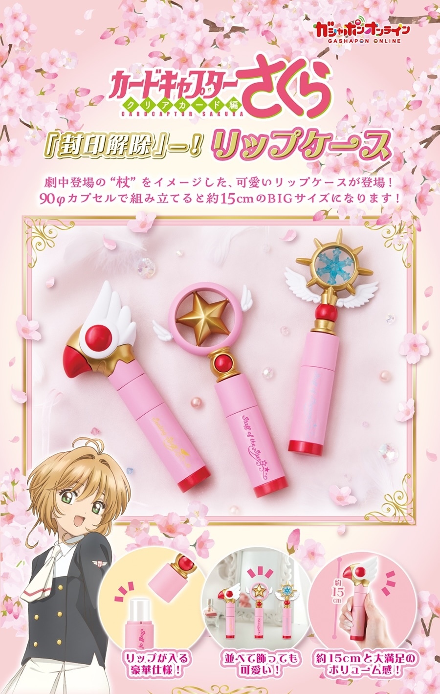 本次的「封印解除―!口紅收納盒收藏」將庫洛牌篇、小櫻牌篇及透明牌篇中小櫻使用的三款魔杖——封印之杖、星之杖和夢之杖製作為高約15公分的口紅收納盒,將原本粉色的仗體加粗,雕刻還原頂端的鳥頭、星型以及捕夢網,並以金屬成型色還原在劇中的質感,讓每次的補妝都充滿了魔力!即便不作為收納盒使用,當作收藏成套陳列也相當可愛!