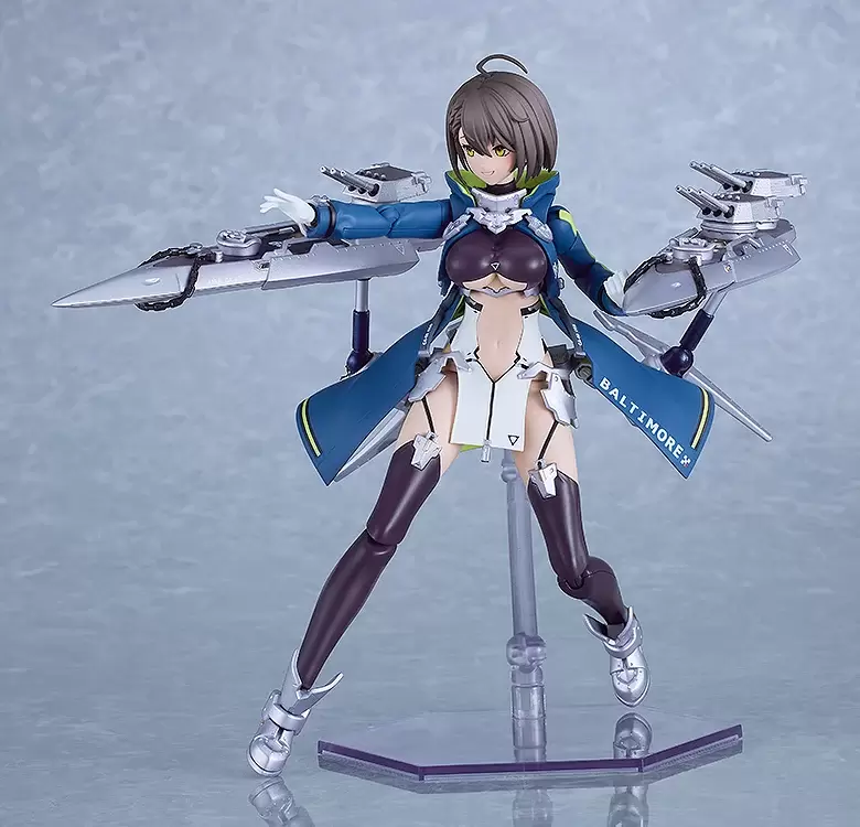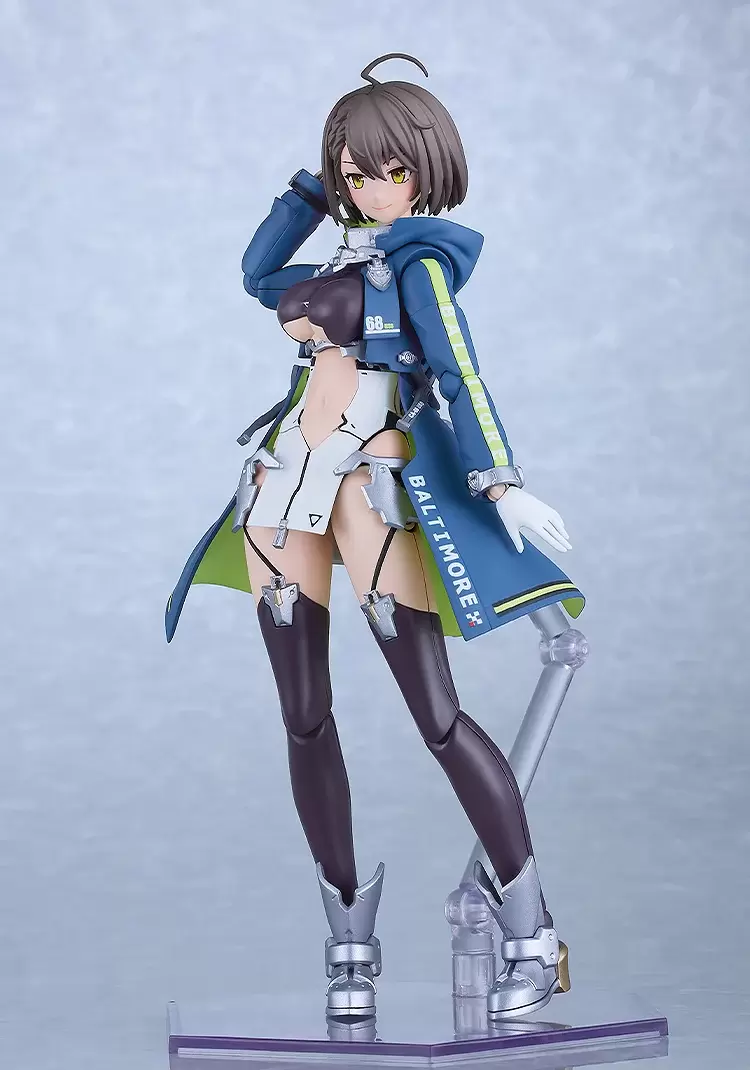 採用各成型色與上色完成零件組裝的「PLAMATEA 巴爾的摩」高約 16 公分,表情除了附上塗裝完成的笑臉零件外,還有透過水貼選擇喜好視線的兩種類型,而在艦裝、大衣部分也能以專用轉印貼紙提升整體完成度,加上可動式的關節、具備可動設計減低干涉的大衣、可拆卸的厚重艦裝,讓你把玩出豐富姿態的巴爾的摩!