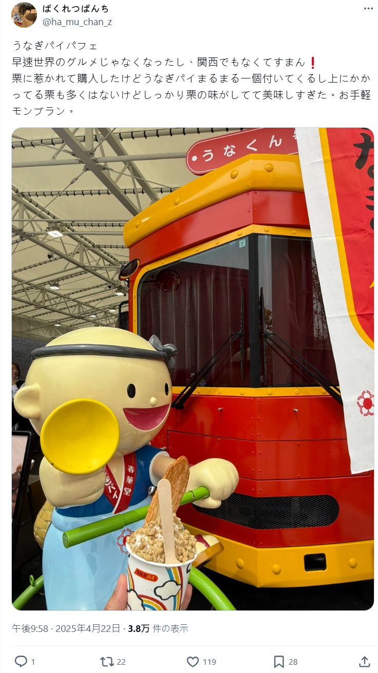 還另外推薦了一個非國際美食的點心「鰻魚派聖代」,但因為被栗子吉祥物吸引還是買了。整支鰻魚派直接插在聖代裡,栗子雖然不多但味道很濃郁,是種像極了蒙布朗的幸福甜點。