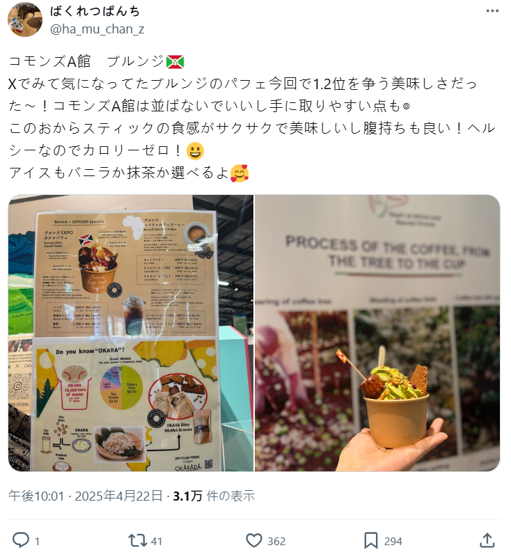 另外還有位於 Commons A館的蒲隆地共和國,這位於東部非洲的小型內陸國家,意外吃到前幾名的好味道!主打健康甜點,有選擇障礙的朋友也別怕,可以選擇香草或抹茶冰淇淋搭配。推主大推「豆渣脆條」,酥酥脆脆又飽足,還自豪說:「這麼健康,熱量當然是零啦(誤)」。