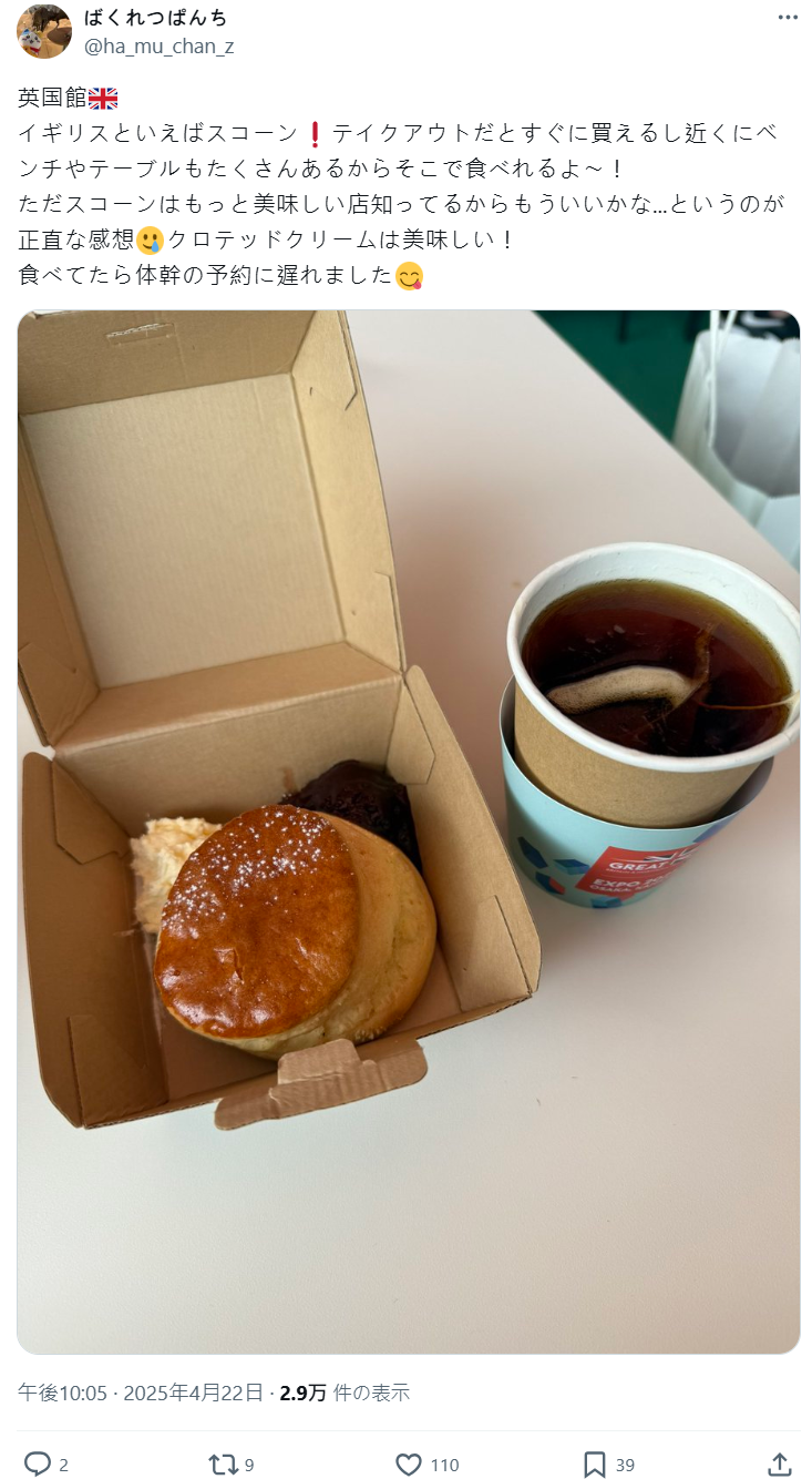 另外在英國館,雖然英國的美食似乎很少被提及,但世博這邊的司康很不錯!外帶可以立刻取餐,附近也有椅子桌子可坐。但她老實說:「我吃過更好吃的司康…所以這個就這樣吧。」,但司康配的凝脂奶油(clotted cream)非常讚,吃起來不膩口又美味。