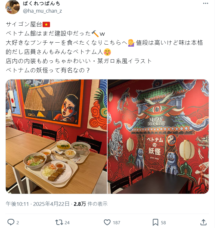 雖然越南館還在蓋,她吃到了一家「西貢屋台」的經典菜——Bun Cha。雖然價格略高,但味道很道地,店員全是越南人,店內裝潢也超可愛,還充滿越南風的奇幻插畫風格。
