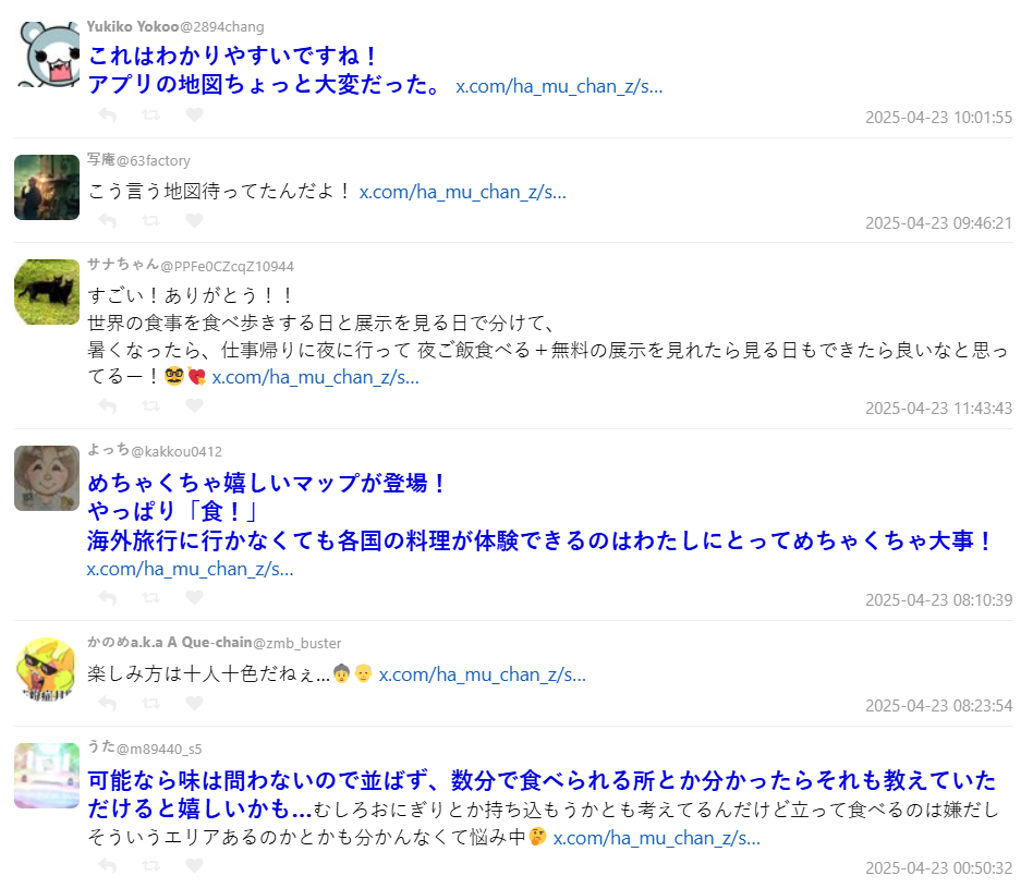 推主ばくれつぱんち發文開玩笑表示說:「搶不到館位的話,那就吃到飽吧!」推文中她表示,自己根本把世博當成是個國際美食節,實際上也真的照這個玩法吃遍四方。雖然還是沒有全部吃過一輪,但把吃過的點製作成地圖,分享給想到世博大啖美食的朋友。