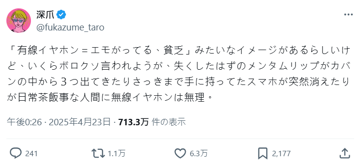 引起熱議的推主貼文寫道:「雖然大家都說有線耳機很文青、很窮酸,但我就是無法用無線的。因為我這種人,包包一翻就冒出三條早該不見的唇膏,剛拿著的手機也能消失,無線耳機根本撐不過一天。」