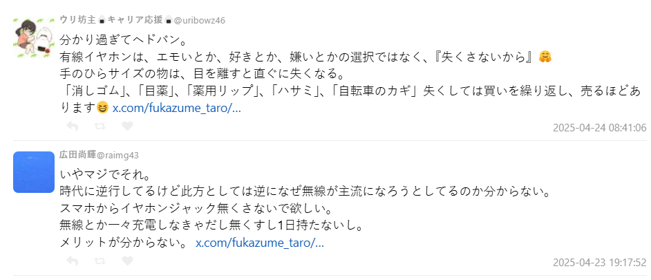 隨著無線耳機越來越普及,日本網路上有網友表示有線耳機悄悄被貼上「文青」、「貧窮」的標籤?近日日本 X 上一則貼文引發大批網友共鳴,針對有線 / 無線耳機到底哪一個孰優孰劣,引起廣泛討論。