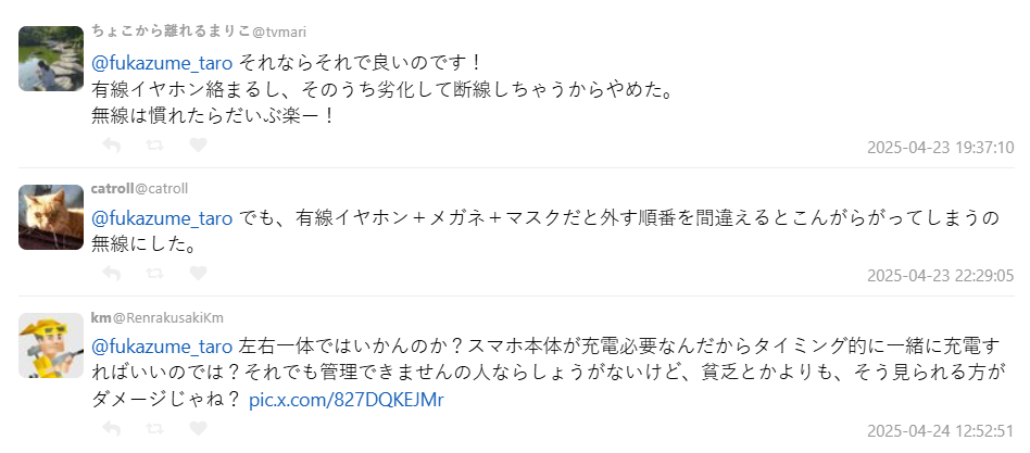 不過也不是沒有人站在無線耳機那邊。有網友指出:「有線耳機超容易打結,還會斷線,我受不了」、「戴眼鏡加口罩再加有線耳機真的會打成一團」。也有人推薦「骨傳導耳機」,左右連在一起的設計比較不怕掉,而且耳朵舒服、不會堵住。