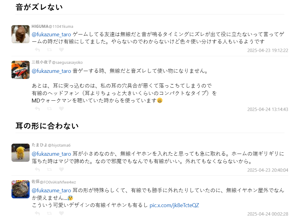 也有人提到無線耳機使用時,玩音樂遊戲無線會延遲,實在沒辦法愛用。也有提到耳型不合、耳機容易掉的問題,讓他們乾脆選擇頭戴式的有線耳機。