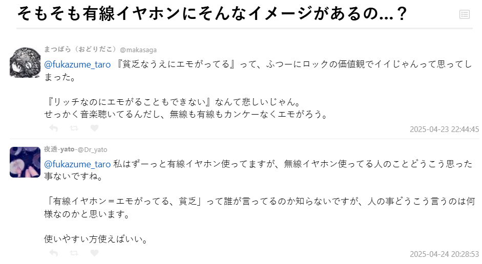 但有些人則質疑這樣的標籤根本莫名其妙,直呼 : 「哪來的說法啊?用什麼耳機是個人選擇,有必要這樣貼標籤嗎?」、「就算貧窮又怎樣?有線耳機有搖滾魂耶!」、「能聽音樂就是幸福,不管用哪種耳機都可以很有感」。