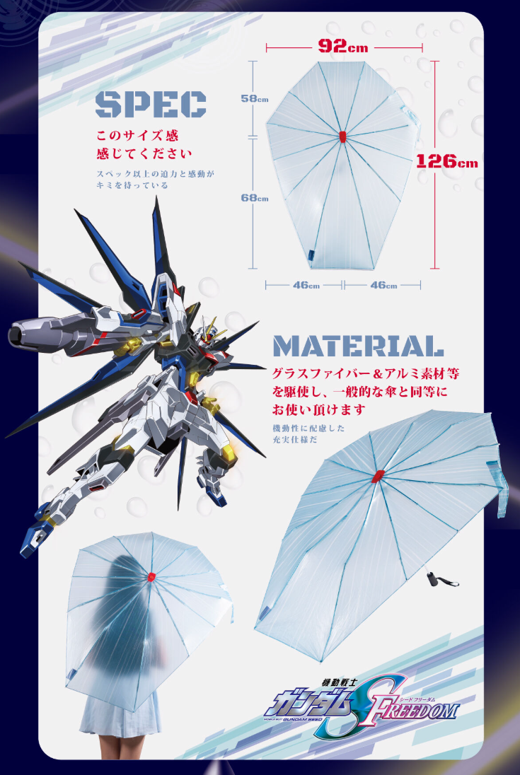 近日日本玩具廠商萬代,除了以《機動戰士鋼彈》為題材的「鋼彈盾牌傘」外,還推出了《機動戰士鋼彈SEED FREEDOM》中攻擊自由鋼彈貳式為靈感,特別設計的「光束盾牌傘」。售價為 6,930 日圓,目前可於日本萬代 PB 網站預購。