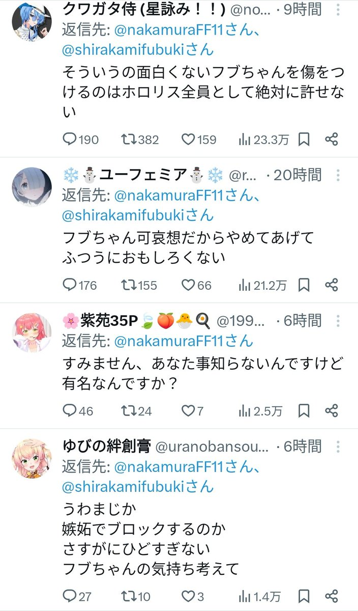 不過對於部分喜歡 Hololive 或主推白上吹雪的粉絲,卻對中村悠一的行為頗為感冒,直呼認為這樣一點也不有趣的行為會讓吹雪受傷,holo 支持者不允許中村這樣的行為。也表示這樣吹雪很可憐,拜託不要這樣子無聊當有趣。