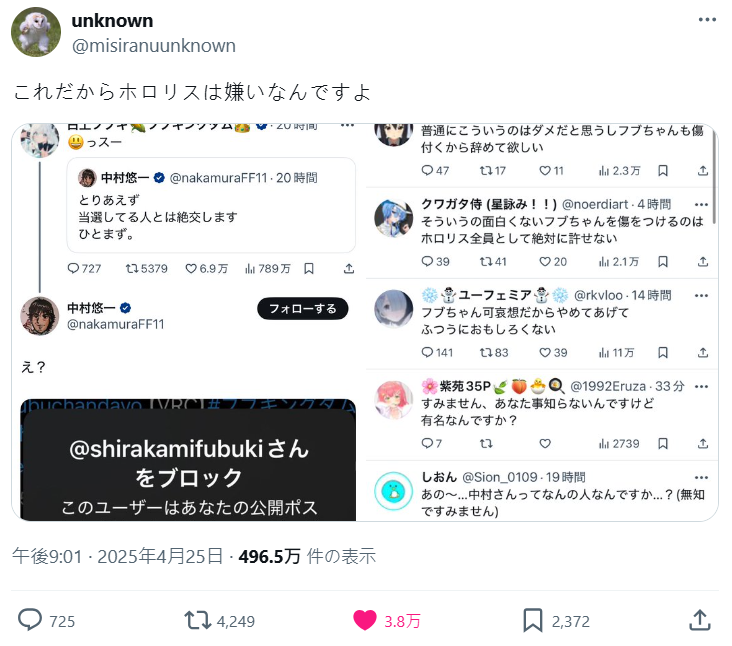 因為中村悠一發文要跟抽中的朋友絕交,其中中選的 Hololive VTuber 友人白上吹雪,被送上封鎖截圖。雖說看起來是兩人的玩笑話,卻有部分白上吹雪的支持者對這樣的行為反感氣憤,甚至在留言處批評中村悠一,引發網民間的討論。