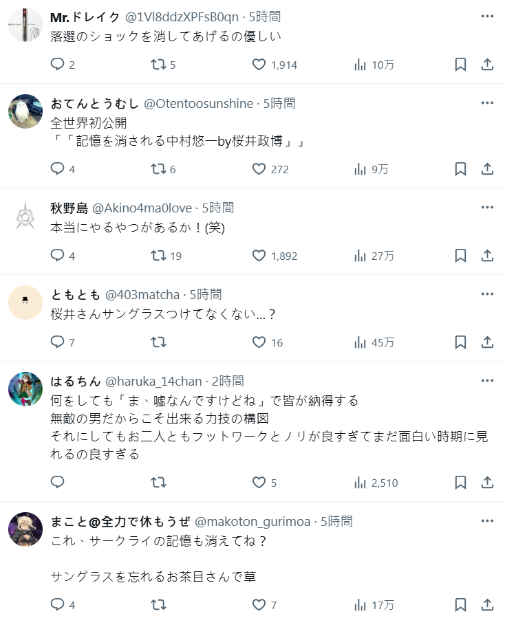 連櫻井政博都不放過,也跑到人家中選底下留言,櫻井則回應 : 「快點用那個能消除記憶的光!」。