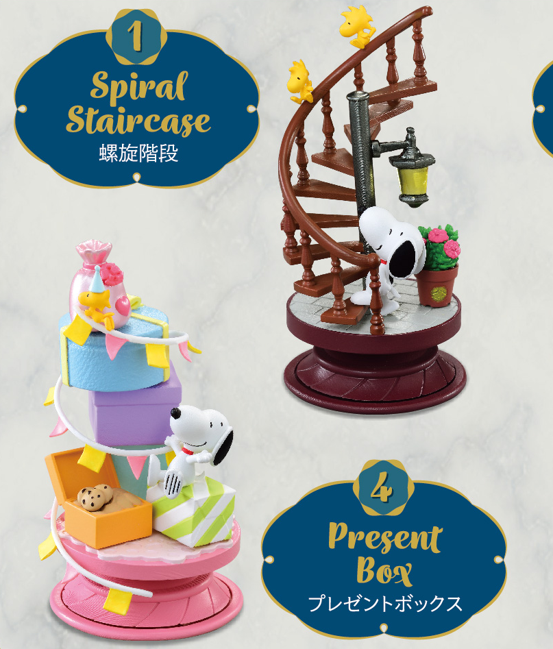 本次 RE-MENT 打造的最新史努比盒玩是以「螺旋」為整體概念,在注入各式各樣意象的同時、又能讓玩具人從全方位欣賞的特殊場景作品。其中「螺旋階梯」、「電影導演」以及「泡泡浴」是利用實體的木製樓梯、膠卷、夢幻的白色泡泡來呈現具備視覺延伸感的螺旋;而「行李箱」、「禮物盒」、「發明家」則是採用豐富的物品堆疊、形成一個個漂亮的螺旋軌道,看上去相當有意思。當然,每一款史努比的造型變化、一起互動的糊塗塌客、一臉訝異的查理·布朗也都相當可愛!