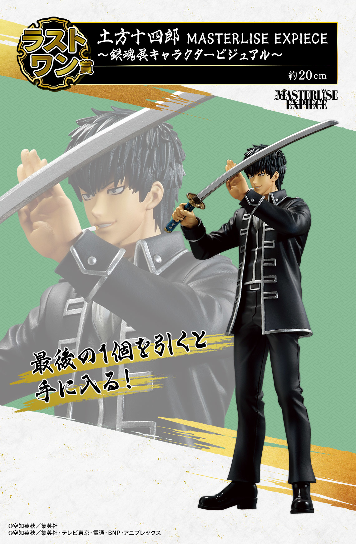 「一番賞 銀魂生誕20周年記念 銀魂展 ~20歲的集合~」,以《銀魂生誕20周年記念 銀魂展》中的主視覺圖造型為基礎,收錄有A賞~H賞+最後賞的豐富獎品!角色模型部分採用魄力尺寸、更高規格的「MASTERLISE EXPIECE」系列打造,分別為 B 賞「坂田銀時」與 C 賞「高杉晉助」最後賞的「土方十四郎~MASTERLISE EXPIECE ~」三款角色,細膩再現精緻的服裝細節!A賞則為90公分的「視覺毛巾~銀魂展主視覺圖~」,將人氣投票 1~20 名的角色都收入其中!另外還有D賞的「SOFVIC chu Q版角色模型」、E賞「伊莉莎白地毯墊」、F賞「壓克力立牌~銀魂展『最佳吐槽』投票~」、G賞「文具~銀魂展『最爆笑的第○訓』投票」~、H賞「橡膠立牌〜銀魂展覽人物視覺圖案」等豐富的獎項!!