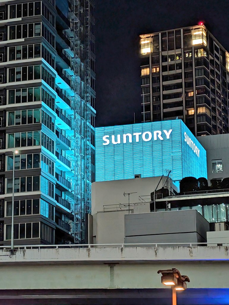 拉近一點看,可以發現幾乎整個側邊都被這棟三得利的藍光照射,整個晚上有如 Cyberpunk 世界觀的景色。