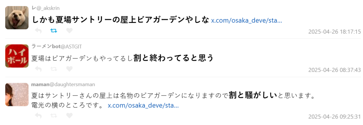 除了藍光問題,這棟鄰近的三得利大樓頂樓,每年夏天還會舉辦啤酒花園活動。有網友指出:「夏天不但光害嚴重,連聲音也超吵,基本上不用想要有安靜的晚上了。」