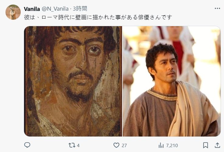 雖說始終被大家勿認為有外國血統,不過神奈川出身的阿部寬可是道地的日本人,不過演出真人版《羅馬浴場》的形象深植人心。也有網友開玩笑說,這不就是出現在羅馬時代壁畫的男演員嗎 www。