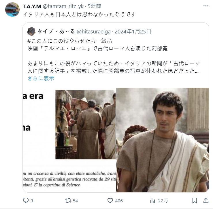 網友也翻出,過去義大利當地報紙報導古羅馬人,使用的照片就是《羅馬浴場》中的阿部寬,連寫文章的義大利記者還說:「欸?原來他是日本人喔……完全沒看出來耶!」