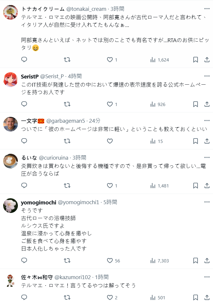 當然說到阿部寬,就不得不提他那個爆速、超輕量的個人網站,永遠都是測試網速有沒有壞掉的最佳選擇。更有人開玩笑說:「這位帥哥根本就是現代版的『日本版羅馬人』,泡溫泉療癒心靈,吃好吃的飯療癒身體,徹底被日本文化同化啦。」