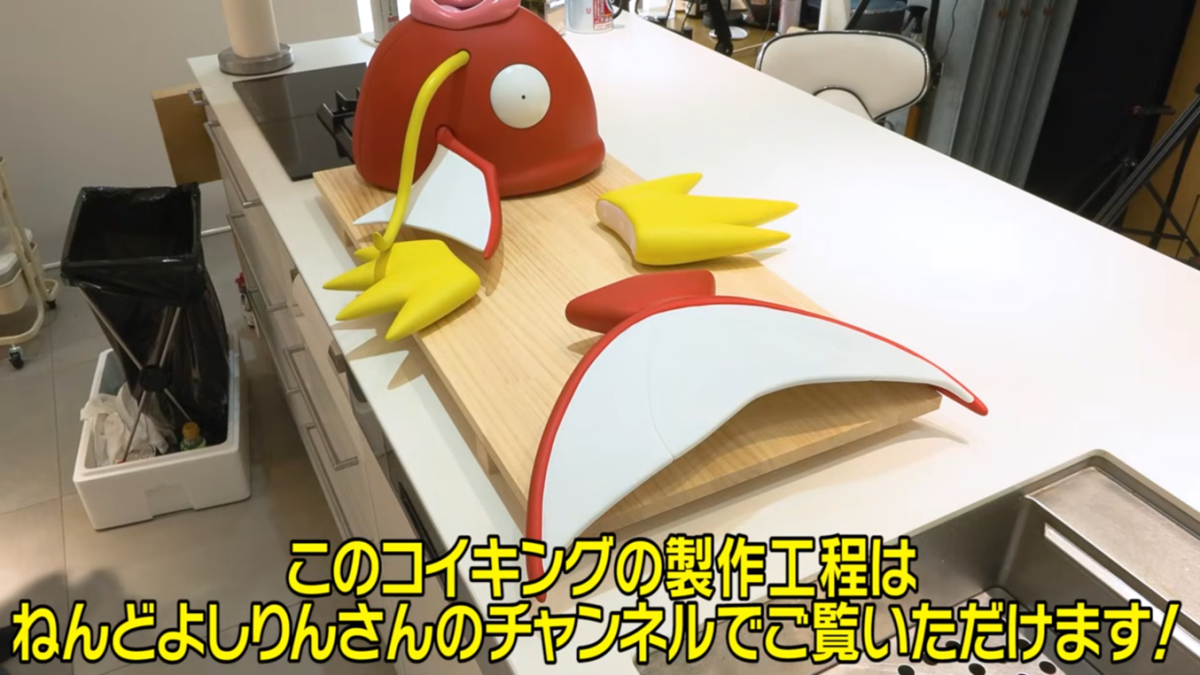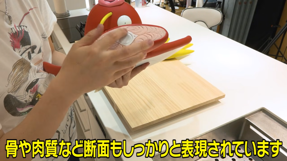 其實這個製作概念,就是利用ねんどよしりん製作的鯉魚王黏土模型,特別設計了剖開的樣貌,可以搭配 Kimagure Cook 的生魚片手藝展現出擺盤的姿態。