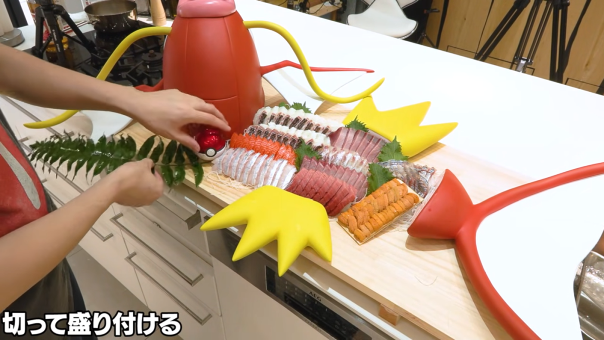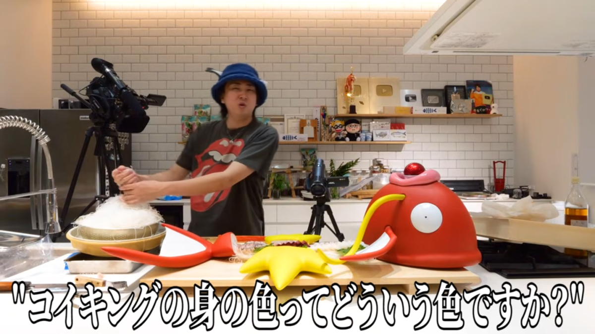 當然後續就是買魚回來展現刀工, Kimagure Cook 也開玩笑說,這影片絕對寶可夢官方會看到,他很好奇到底鯉魚王的肉到底是什麼顏色的www ?
