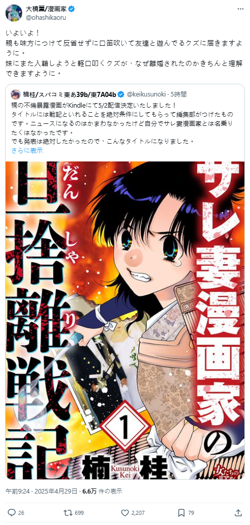 今日 ( 4/29 ) 楠桂在個人 X 宣布,自編自畫,內容揭露自己真實經歷的婚姻背叛與內心煎熬的新作品《被背叛妻子的斷捨離戰記》( サレ妻漫画家の旦捨離戦記 ) 即將在 5 月 2 日在 Kindle 上架,立刻引起網民粉絲關注,沒想到事隔一個多月真的動筆了。