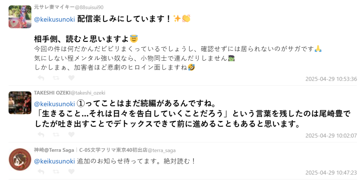 楠桂的雙胞胎姐妹,同為漫畫家的大橋薫也發文大量支持,表示終於看到了!希望這本作品能好好傳達到那個連爸媽都拉攏過來、完全沒在反省,還能一邊吹口哨一邊跟朋友出去玩的爛人手上。也希望那個還敢開玩笑說要跟我妹再結一次婚的爛咖,能好好認清楚自己到底是為什麼會被離婚的。