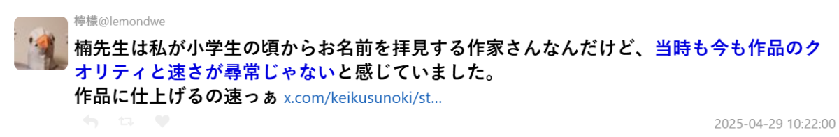 此外,也有網友提及,楠桂早年以細膩又快速的作畫技巧著稱,此次新作同樣保有過去高水準的完成度,讓老粉絲們感動不已。