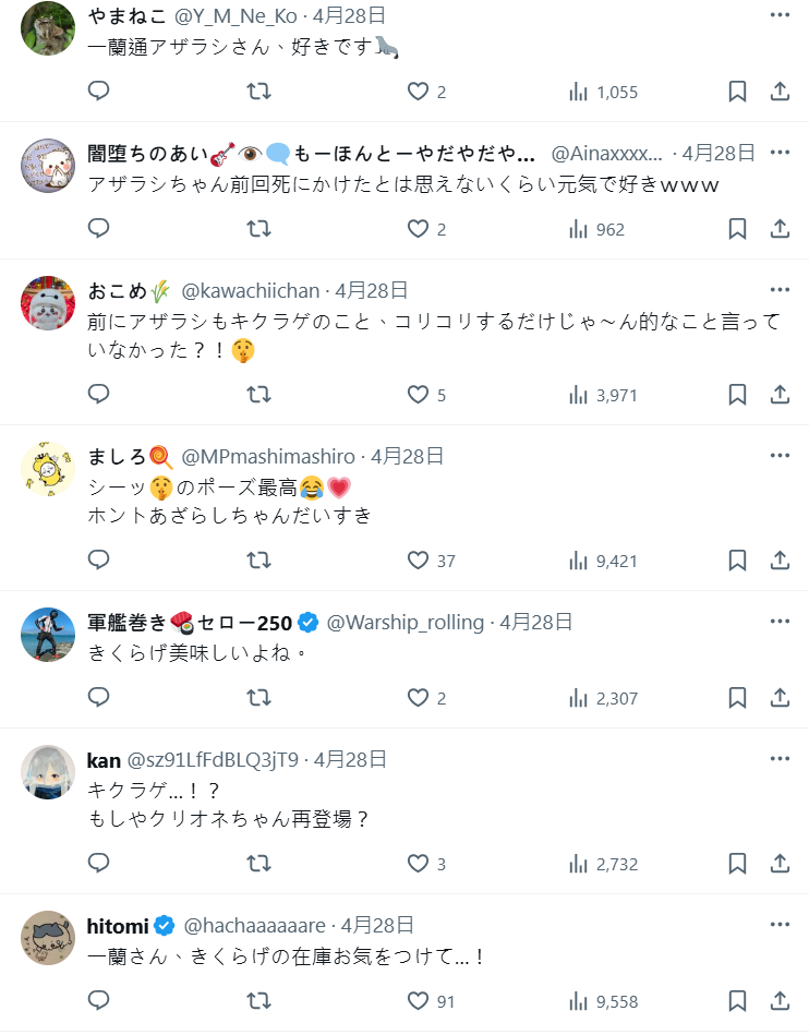 這篇貼文立刻在 X 上爆紅,留言區不少人留言說:「這招我懂,真的很好吃」、「我也想看看海豹的點餐單長怎樣」、「這根本可以出吉伊卡哇聯名套餐了吧」、「黑木耳配豚骨湯真的讚」、「一蘭阿...木耳庫存要小心了」。