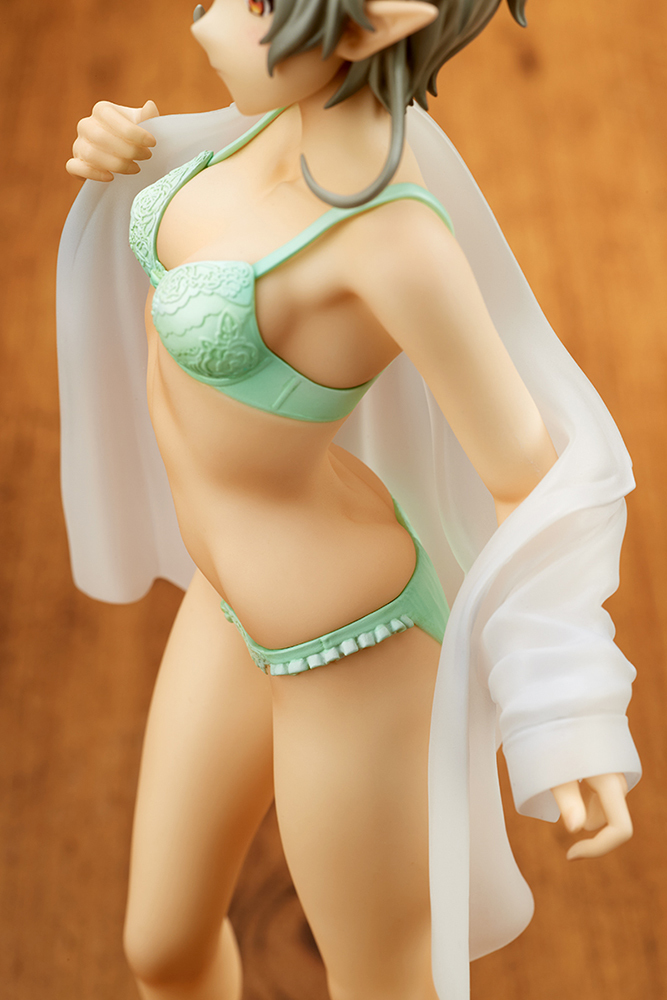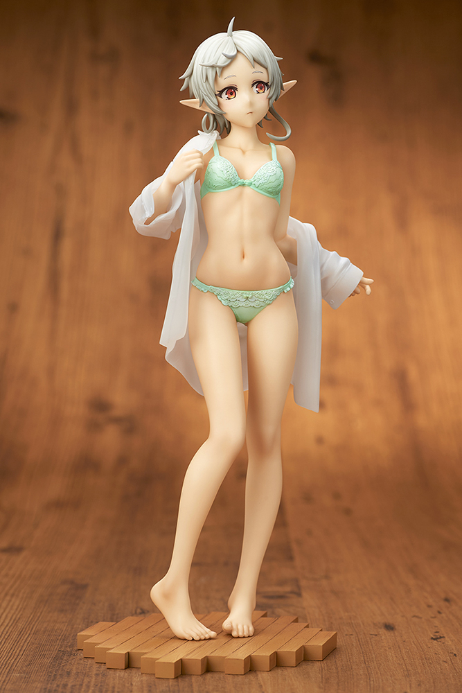 本作高約 23 公分,是以希露菲與魯迪久違重逢之後的成年造型為題設計,打造出正處於更衣瞬間、毫無防備的誘人姿態!自菲托亞領地轉移事件變成白色的頭髮形塑出彷彿剛起床、隨意亂翹的樣貌,紅色瞳孔擁有細緻描繪,招牌的尖耳朵、纖瘦的軀體線條,以及白皙柔嫩的肌膚都有很棒的呈現,施以精美刺繡的內衣搭配具備透明感的白色襯衫,整體散發成熟女性的魅力!