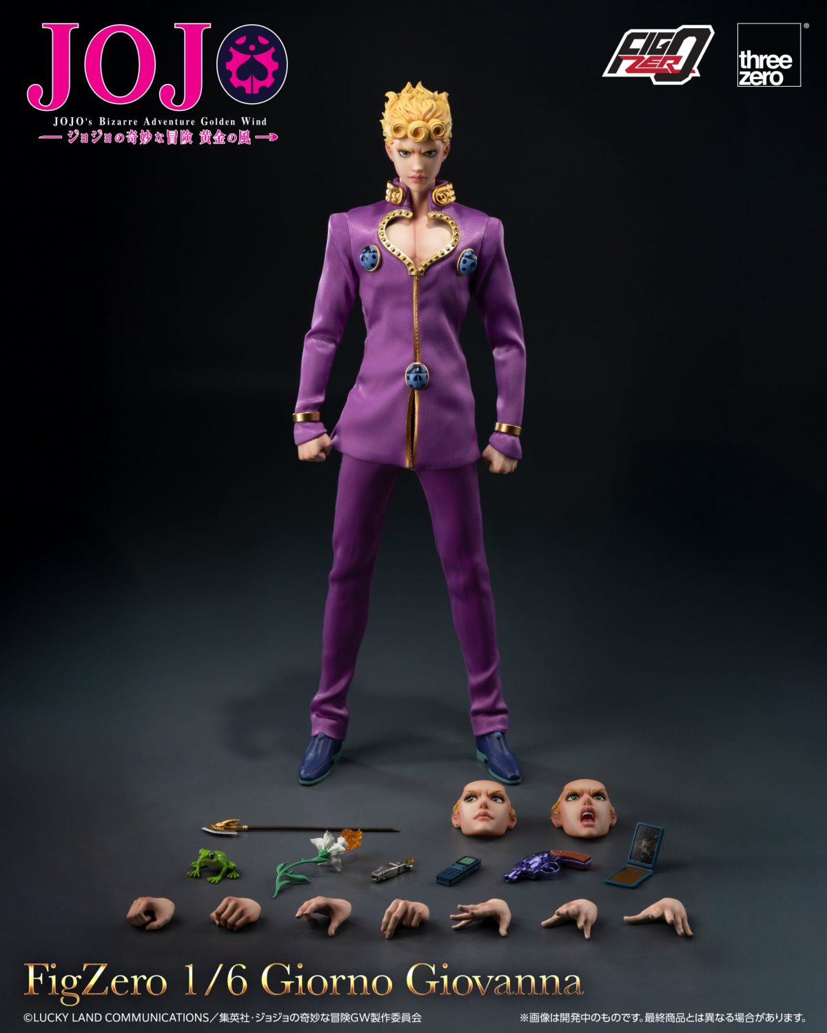 本次的Figzero喬魯諾‧喬巴拿高約29.3公分,全身作有33處可動關節,連眼球也能夠調整視線方向!雕刻細緻再喬魯諾的面容特徵以及標誌性的衝擊髮型,以緞面布料等複合媒材剪裁還原騷氣十足的粉紫色心形開胸衣,露出胸口結實的肌肉線條,並塗裝加深部分細節讓整體看起來更加精緻!配件部分收錄有三款替換表情、左五種右四種的手部替換件、黃金箭、青蛙、點燃的打火機、變成花的打火機手機、放有DIO照片的錢包以及米斯達的手槍,可以搭配靈活的可動再現經典的JoJo立和劇中的場景!