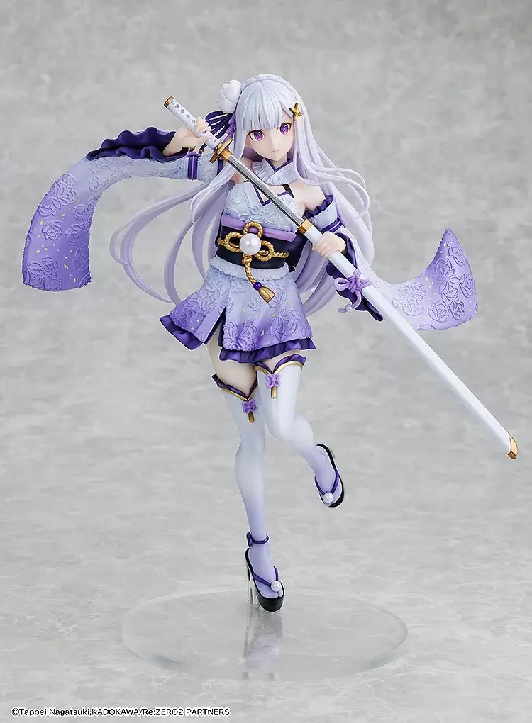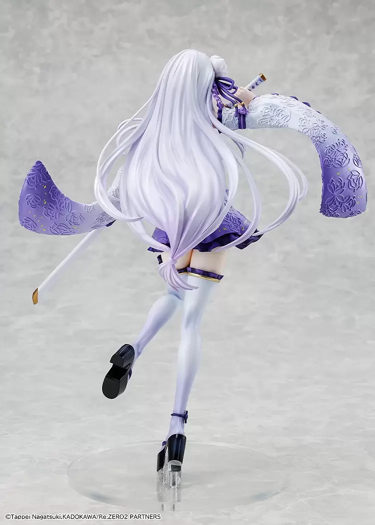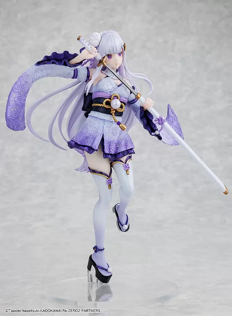 「KDcolle 愛蜜莉雅 戰鬥服Ver.」1/7比例模型,以原創插畫為基礎,將日式服裝+戰鬥服的造型立體化!尺寸全高約 24 公分,呈現出從容不迫的拔刀姿勢;精心刻畫出和式的布料紋理,打造美麗的花紋浮雕,服裝採用柔和的漸層紫色調與愛蜜莉雅的形象色呼應,珍珠漆塗裝營造華麗的質感,並刻畫出輕盈飄動的動態感~隨著她的動作柔軟流動的銀髮,更加襯托出氣質與優雅!